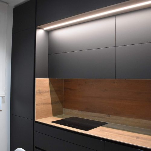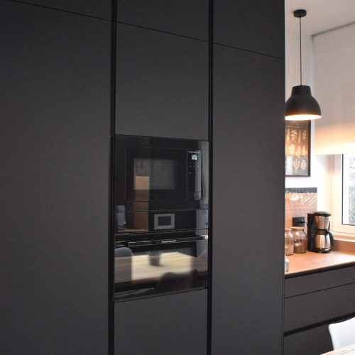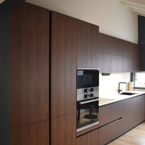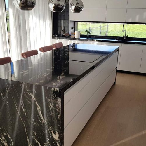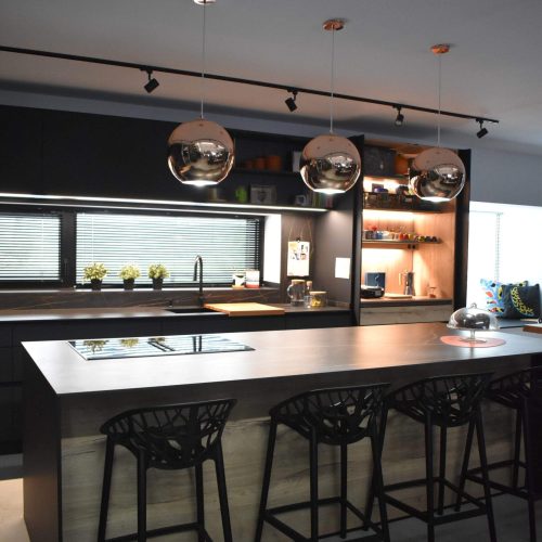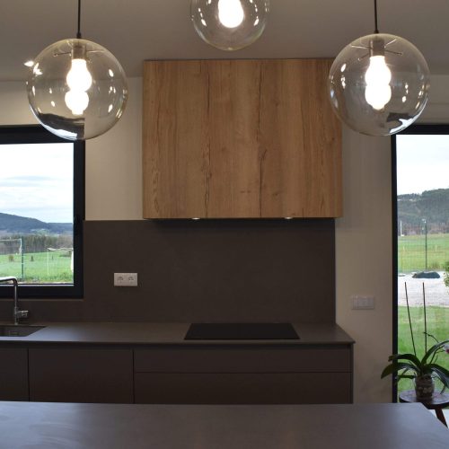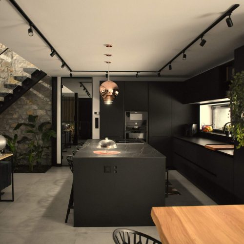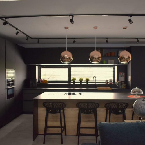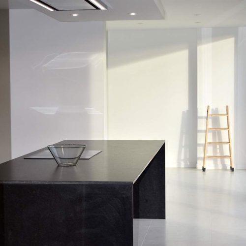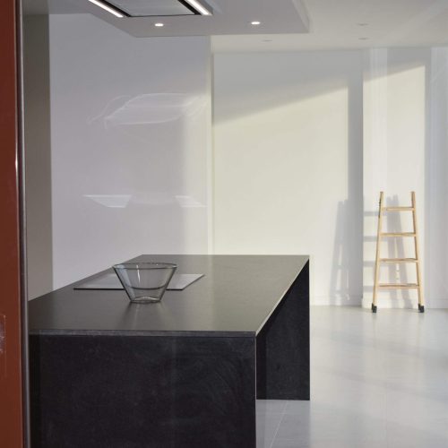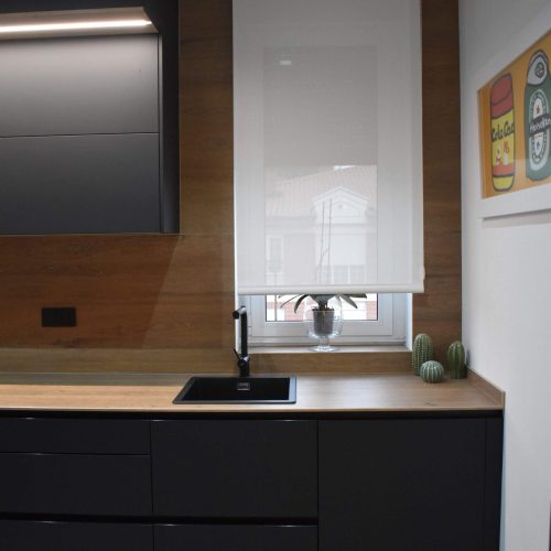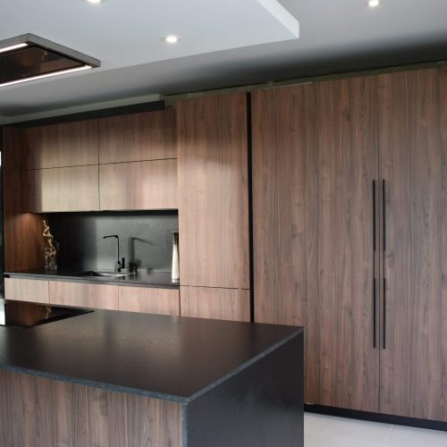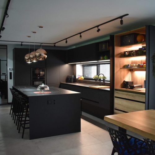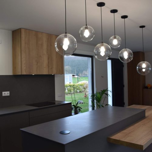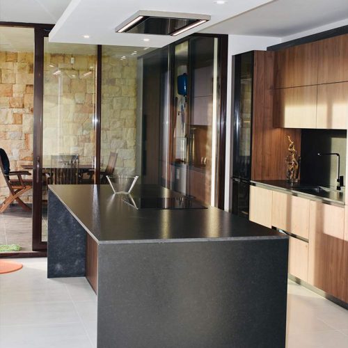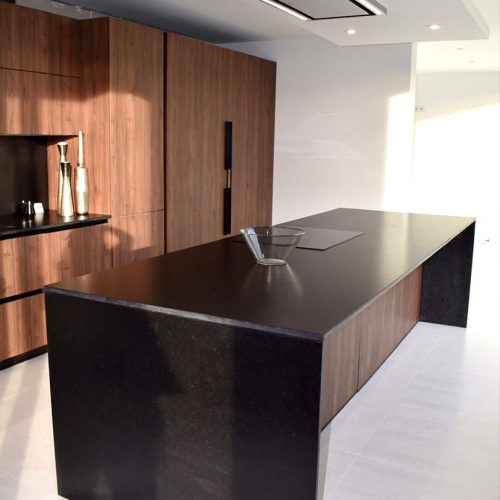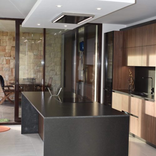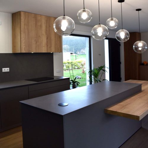 Una gran isla de cocina de amplios cajones y un cómodo espacio para comer. Tenemos además otra superficie donde se incluye un fregadero y una vitro junto a la ventana de vistas al jardín. Materiales en negro satinado combinado con madera maciza noble le dan un diseño funcional y atemporal, pensado para la vida alrededor.