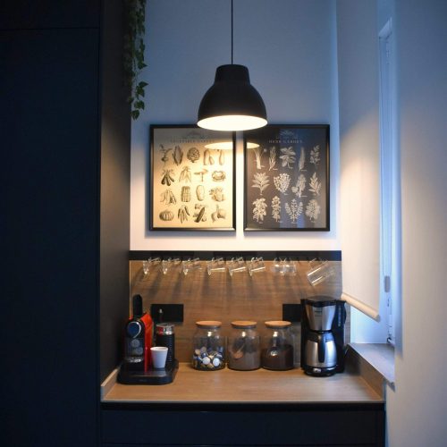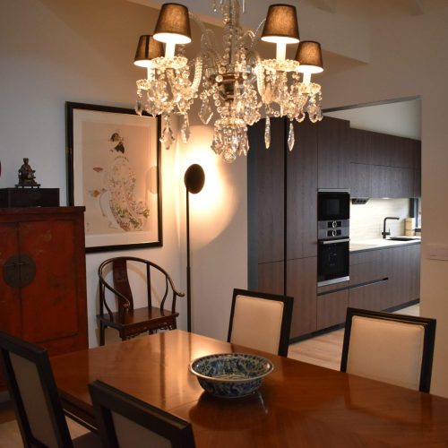 En la isla figura un comedor para cuatro personas muy útil para el desayuno o comer de manera informal. Por último debido a la luz natural proveniente del exterior, la iluminación artificial es obra de tres pequeñas lámparas colgantes.