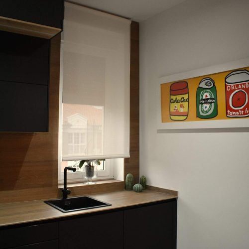En esta cocina observamos un predominante color blanco que solo se ve interrumpido por la encimera de mármol negro veteado en tonos blancos y el suelo laminado en madera beige. Una de las principales características son la multitud de armarios y cajones que se reparten por toda la cocina para guardar menaje y utensilios necesarios para el día a día.